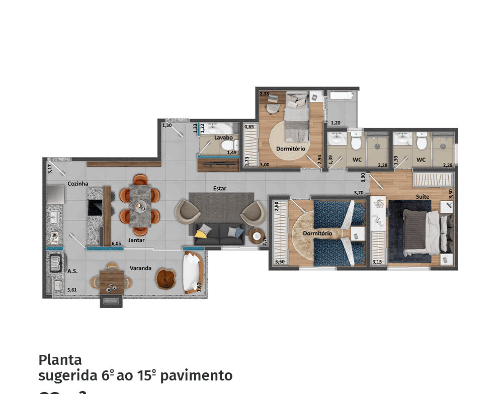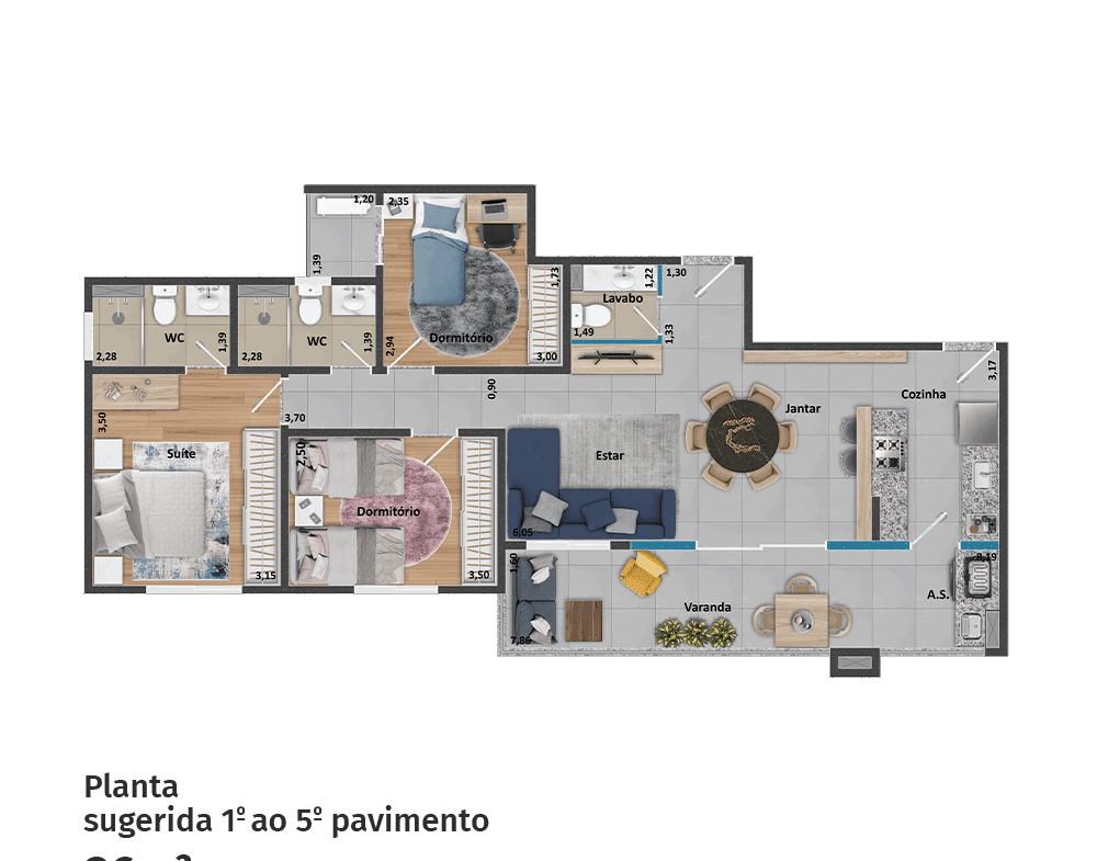 Apartamentos área útil 92 m2 e 96 m2